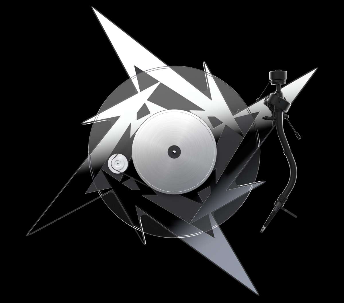 Der gemeinsam mit der Band Metallica entworfene und von Pro-Ject in Europa produzierte Plattenspieler ist die Musikmaschine nicht für Metal-Fans! Der Glasteller erlaubt einen freien Blick auf das ikonische Bandlogo, das die Chassisform dominiert. Eine auf Spiegelglanz polierte und exakt in der Form des Logos geschnittene Metallplatte bringt dem MDF-Chassis zusätzliche Stabilität und amtlichen Metal-Look.