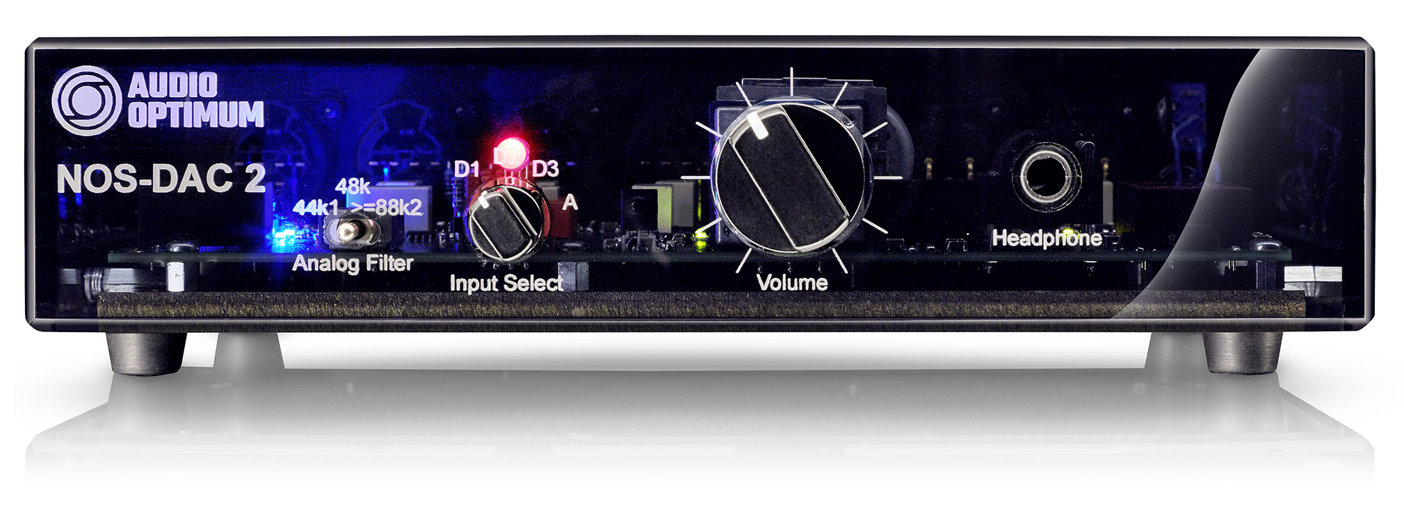 Der Non Oversampling DA-Wandler entspricht dem Audio Optimum NOS-DAC, verfügt aber zusätzlich über drei umschaltbare SPDIF-Eingänge, die wahlweise coaxial (75Ω-Cinch) oder symmetrisch (110Ω-XLR) ausgeführt sein können. Weiterhin ist das analoge Rekonstruktionsfilter für verschiedene Samplingfrequenzen manuell umschaltbar, um sowohl für 44,1kHz (Audio-CD) als auch für 48kHz (Digital-Rundfunk) und ≥88,2kHz (Audio-DVD) einen linearen Frequenzgang bis 20kHz ohne das klangverfälschende Oversampling mit Digitalfilter zu realisieren.