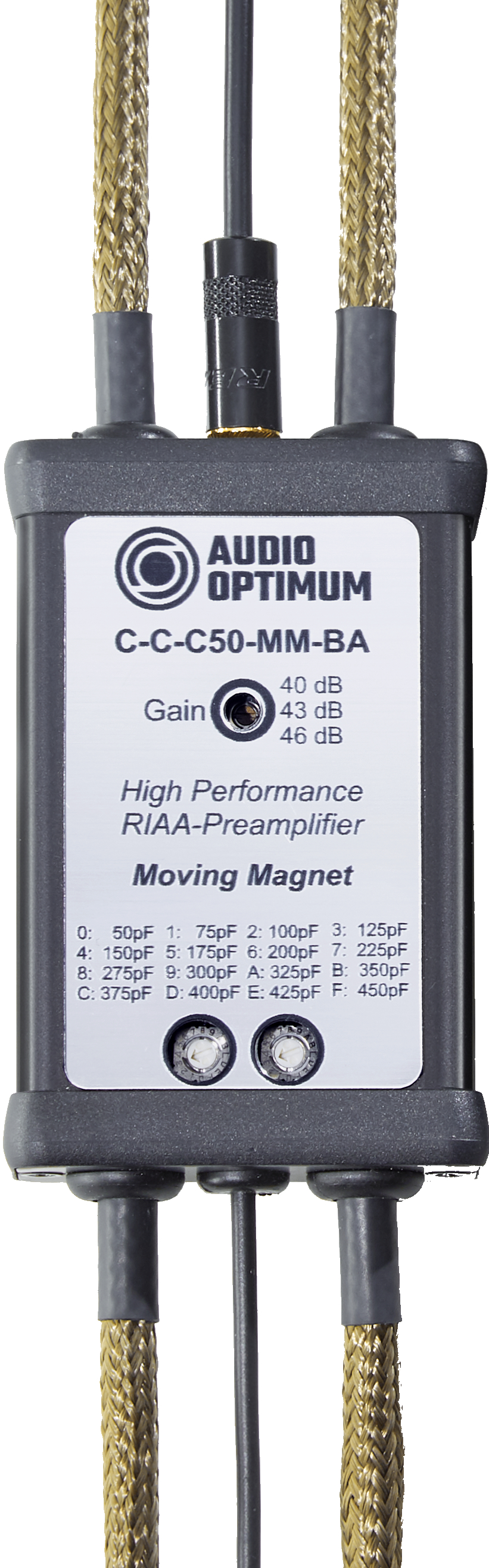 Der Eingangswiderstand des C-C-C50-MM-BA beträgt 47kΩ und die Eingangskapazität kann über Miniatur-Drehschalter in 16 Stufen von 50pF bis 450pF exakt an das jeweilige Magnetsystem angepasst werden, wobei die Kabelkapazität bereits mit eingerechnet ist.