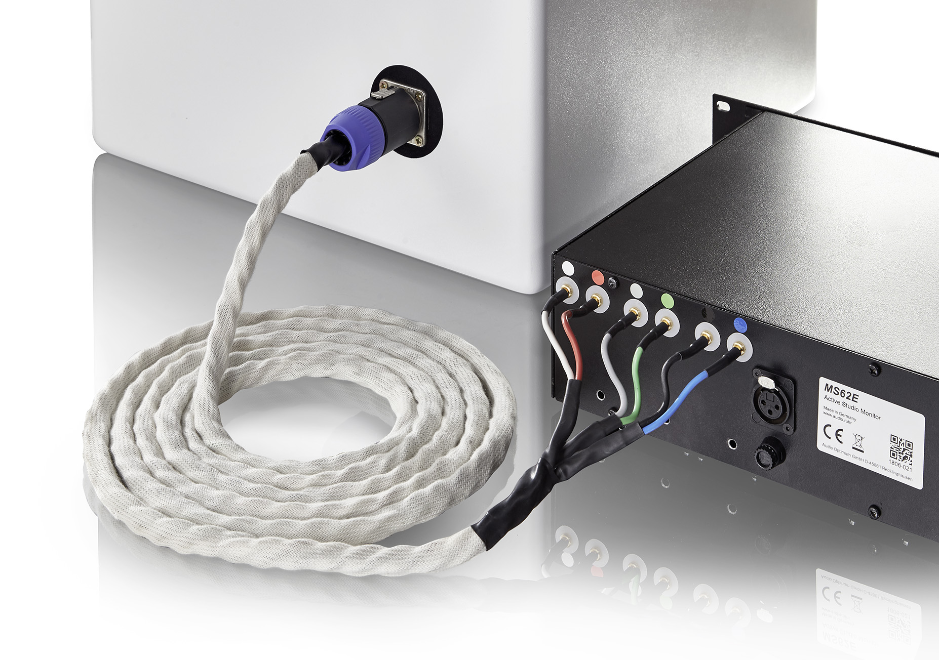 Standardmäßig hat das Monitorsystem MS62E zwei 3,3m lange Spezialkabel mit 6 x 2,5mm2 Cu-Querschnitt, wobei jeweils zwei Adern paarweise verdrillt sind. Die drei Aderpaare (Twisted Pairs) werden von einem Geflechtschlauch aus Baumwolle umschlossen, einem Naturmaterial, das statische Aufladung verhindert und sich klanglich weitgehend neutral verhält.